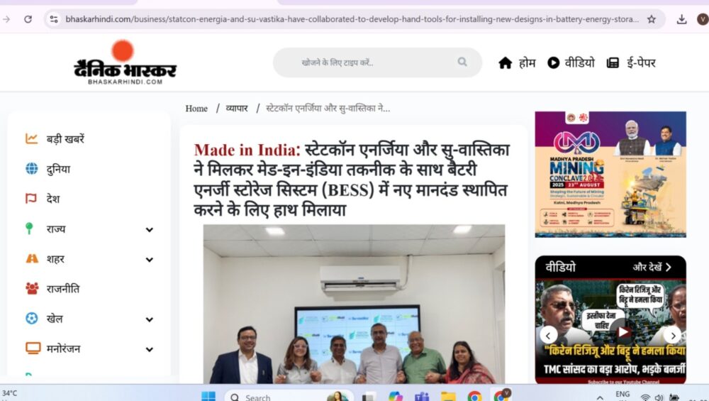 भारत की स्वच्छ ऊर्जा की ओर संक्रमण को तेज़ करने के एक साहसिक कदम में, स्टेटकॉन एनर्जिया और सु-वास्तिका, बैटरी एनर्जी स्टोरेज सिस्टम, पावर इलेक्ट्रॉनिक्स और नवीकरणीय ऊर्जा के क्षेत्र में देश के दो सबसे सम्मानित नाम, ने एक औपचारिक रणनीतिक सहयोग में प्रवेश किया है। यह रणनीतिक मार्केटिंग गठजोड़ घरेलू चैनलों और निर्यात के लिए चुनिंदा अंतर्राष्ट्रीय देशों में अत्याधुनिक लिथियम-आधारित बैटरी एनर्जी स्टोरेज सिस्टम (BESS) के प्रचार और तैनाती पर केंद्रित होगा।